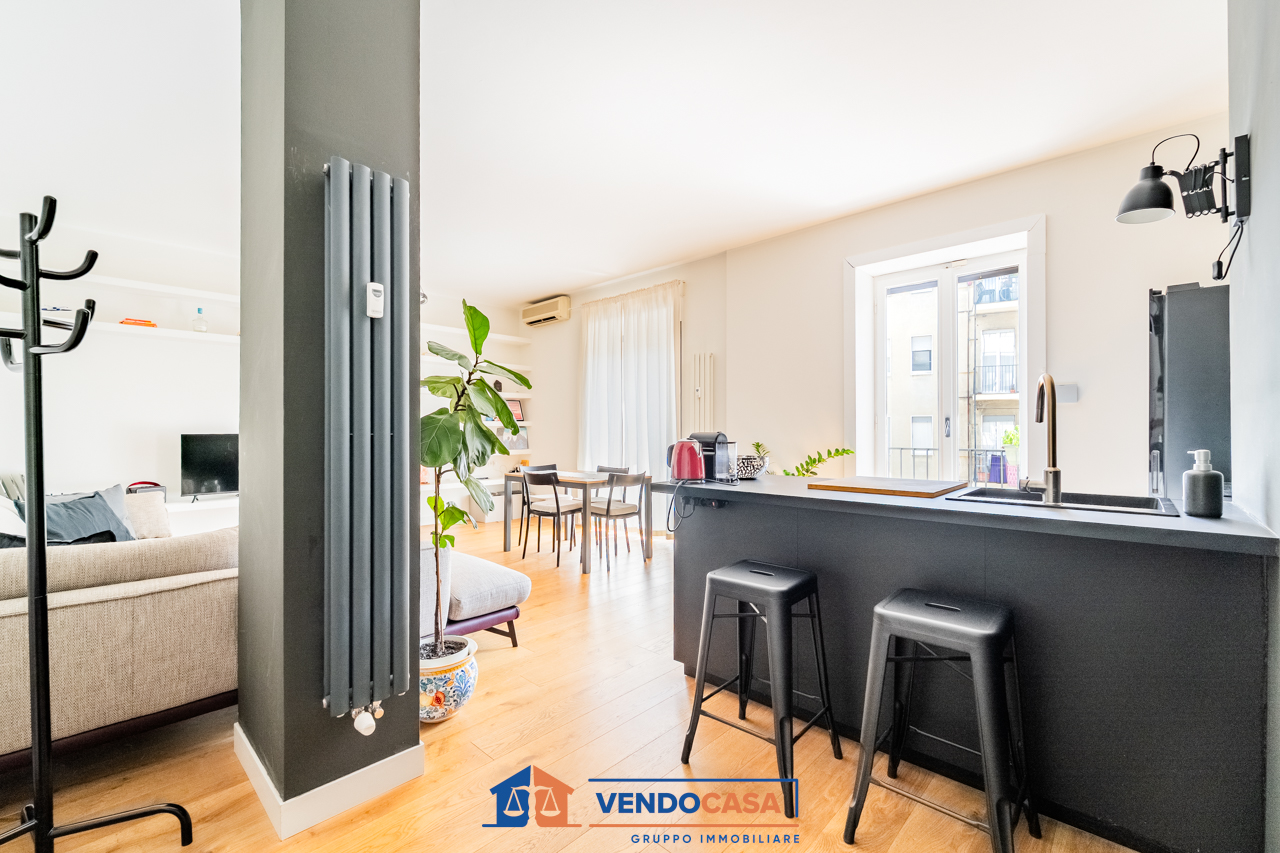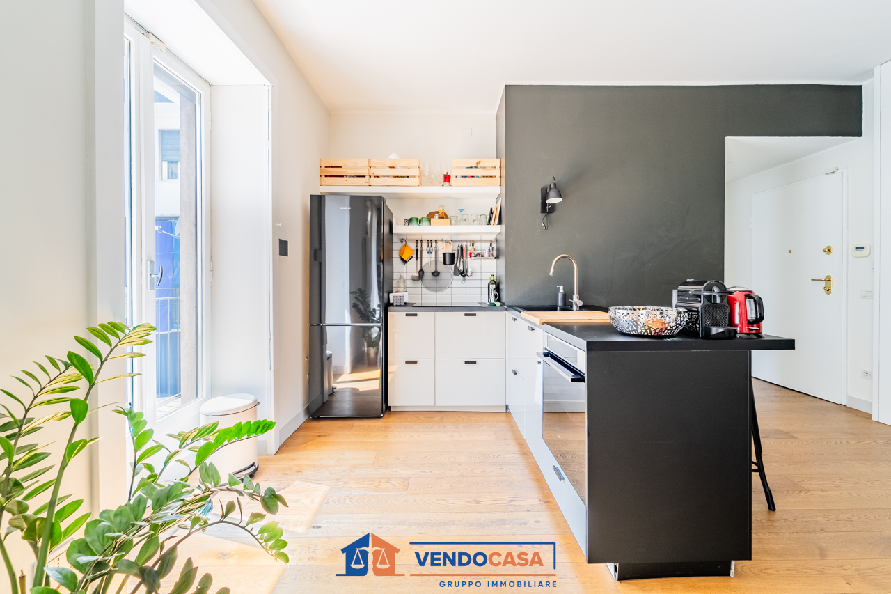 L'immobile, al quarto piano, gode di molta luce naturale grazie all'ampio balcone, risultando tranquillo e silenzioso. L'appartamento è stato completamente ristrutturato e comprende un ingresso con disimpegno, un ampio soggiorno con cucina a vista e accesso al balcone, una camera matrimoniale con cabina armadio e accesso al balcone, e un bagno finestrato.