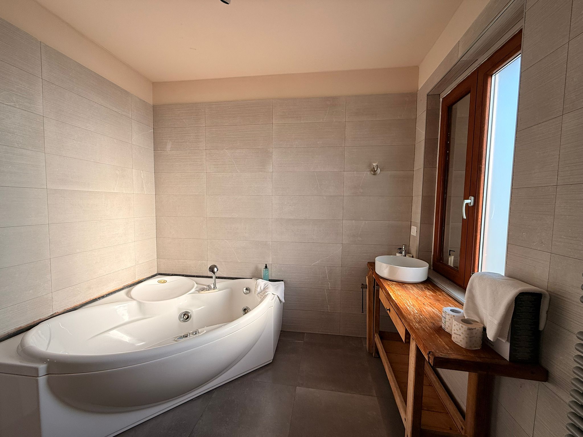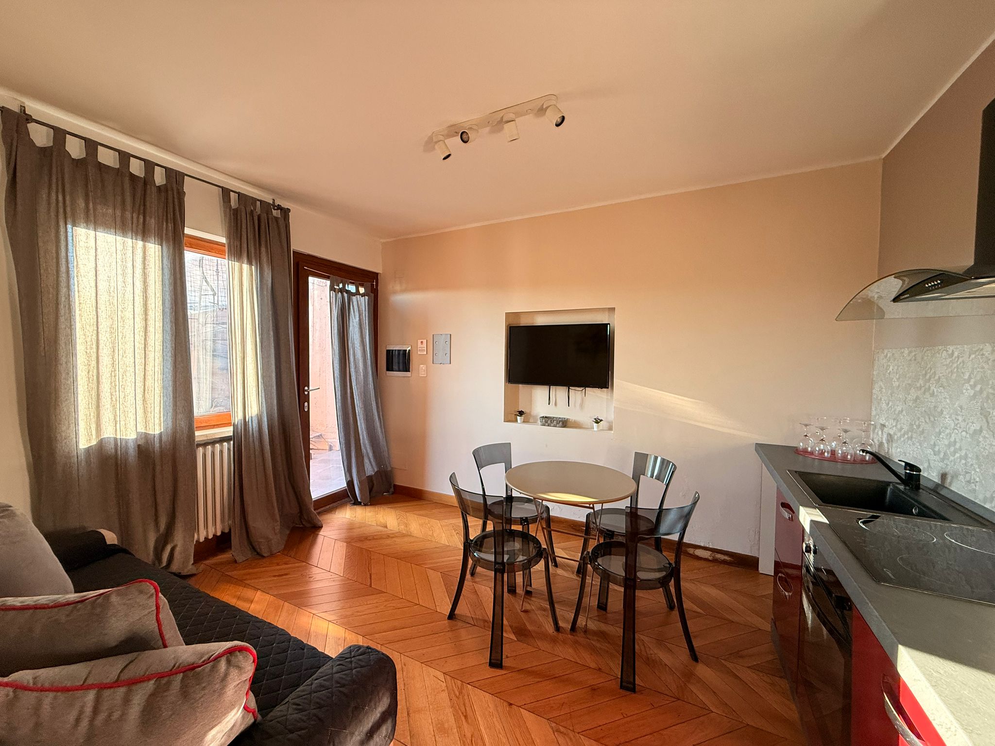 L’appartamento è composto da luminoso soggiorno con cucina open space, camera da letto matrimoniale e servizio finestrato con vasca idromassaggio, pensato per offrire il massimo comfort.