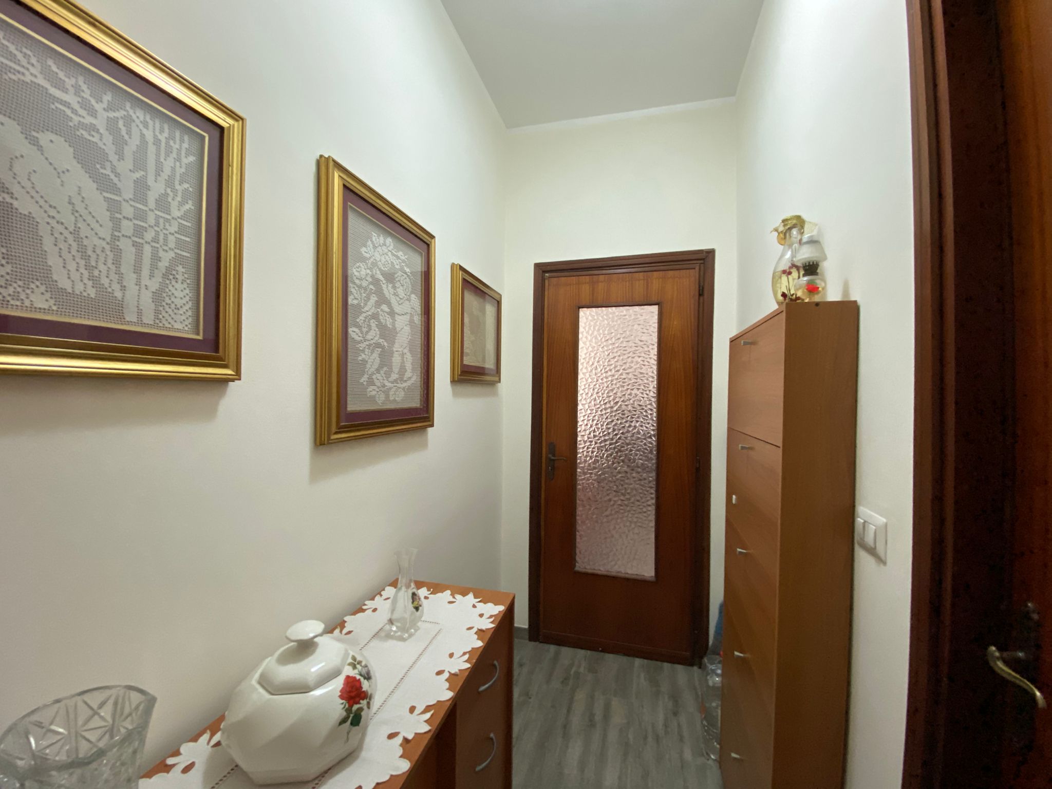 Un comodo disimpegno accompagna verso la zona notte, dove trovano spazio una cucina abitabile, un bagno moderno con doccia e una camera da letto matrimoniale dalle generose dimensioni.